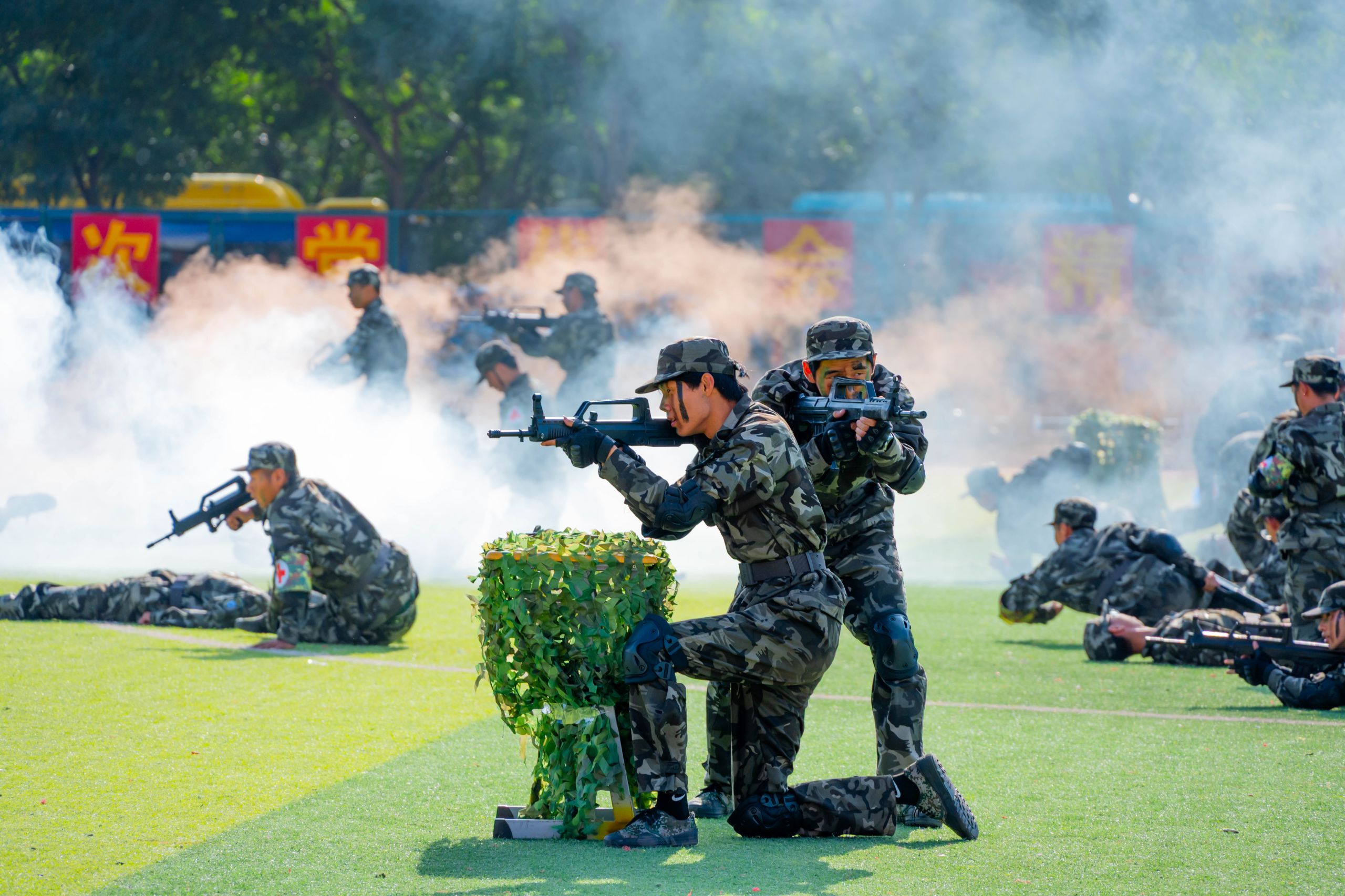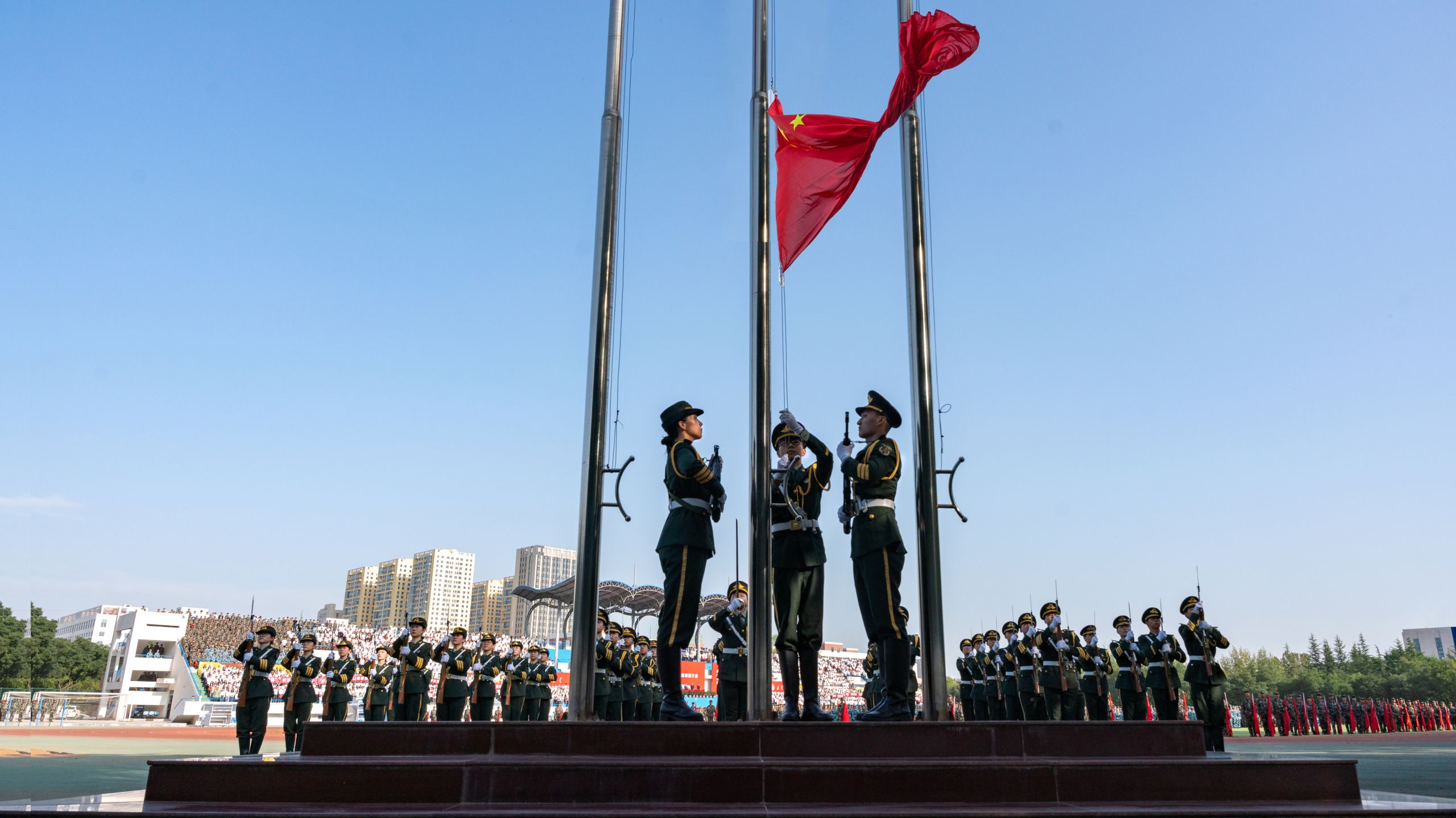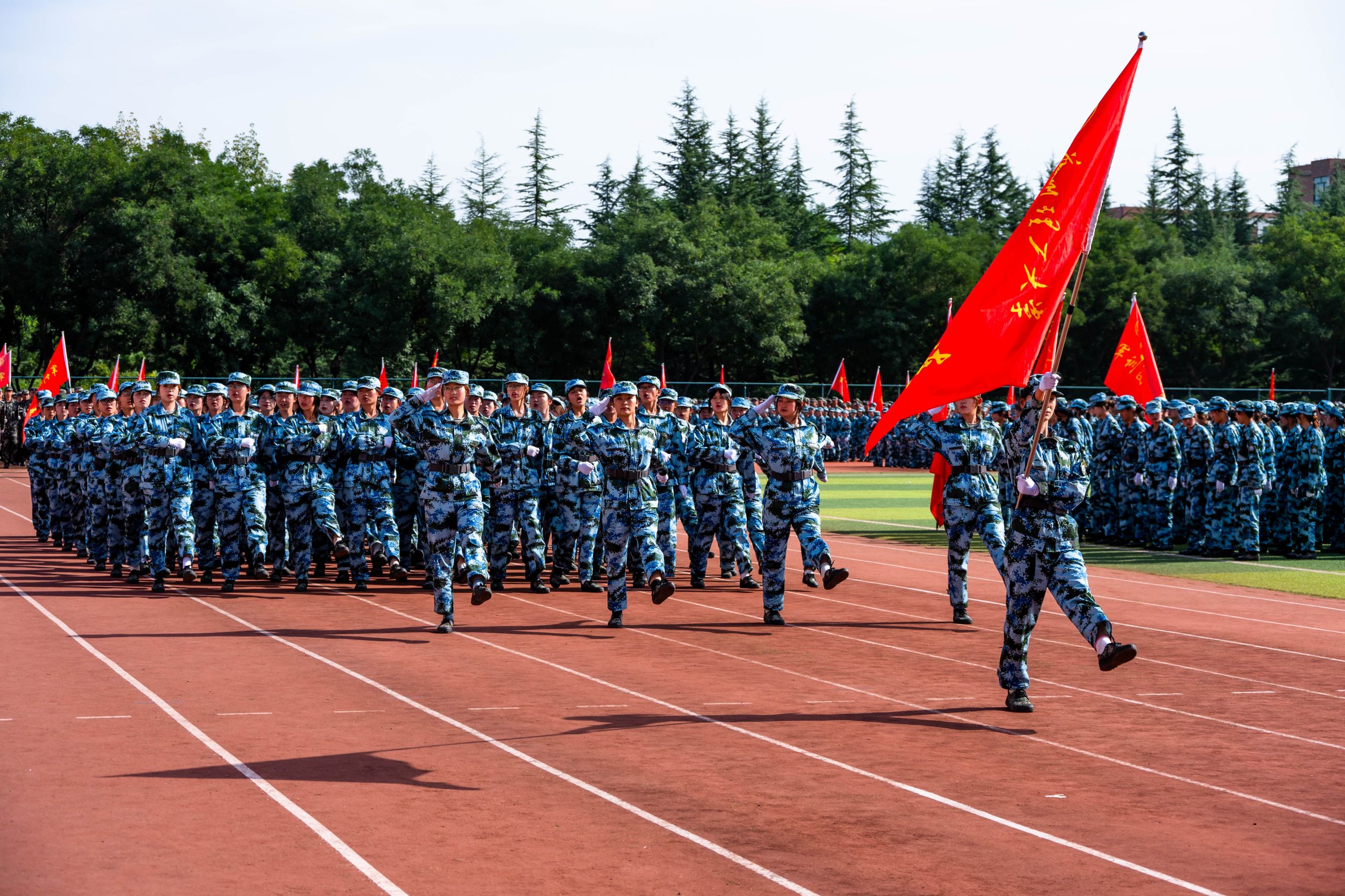 大会在庄严的升国旗仪式中拉开帷幕。新生军训成果汇报展示精彩纷呈,战术方阵模拟战场救护,队员协同配合展现应急响应硬实力,战旗方阵猎猎如焰,拳术、棍术、刺杀操、擒敌拳、匕首操方阵震撼登场,充分展现新生的昂扬斗志和蓬勃朝气。