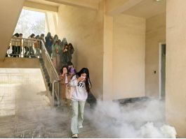 演练开始,随着模拟烟雾装置启动,楼道内瞬间弥漫“浓烟”,同学们反应迅速,用湿毛巾紧捂口鼻,在正确引导下弯腰低姿沿墙右侧单列有序撤离,安全抵达集合点。实操演示环节,工作人员现场示范了灭火器、消火栓等消防器材的正确使用方法,并邀请部分学生进行实际操作,确保大家能够熟练掌握消防器材的操作技能。