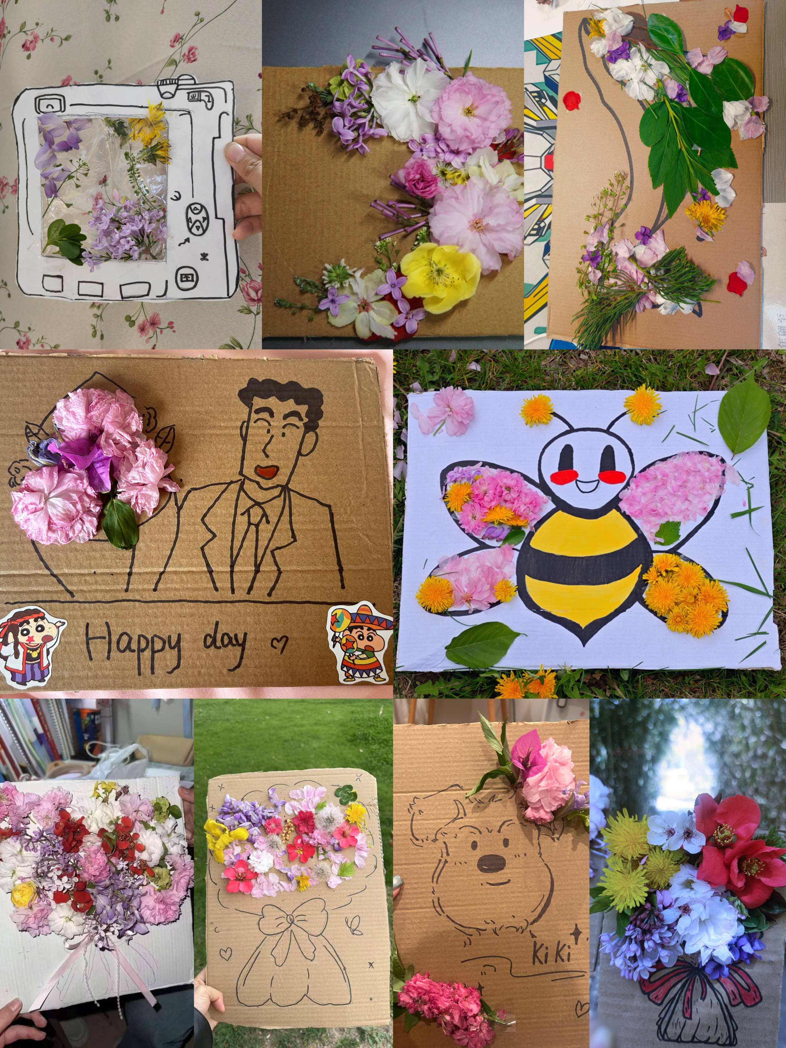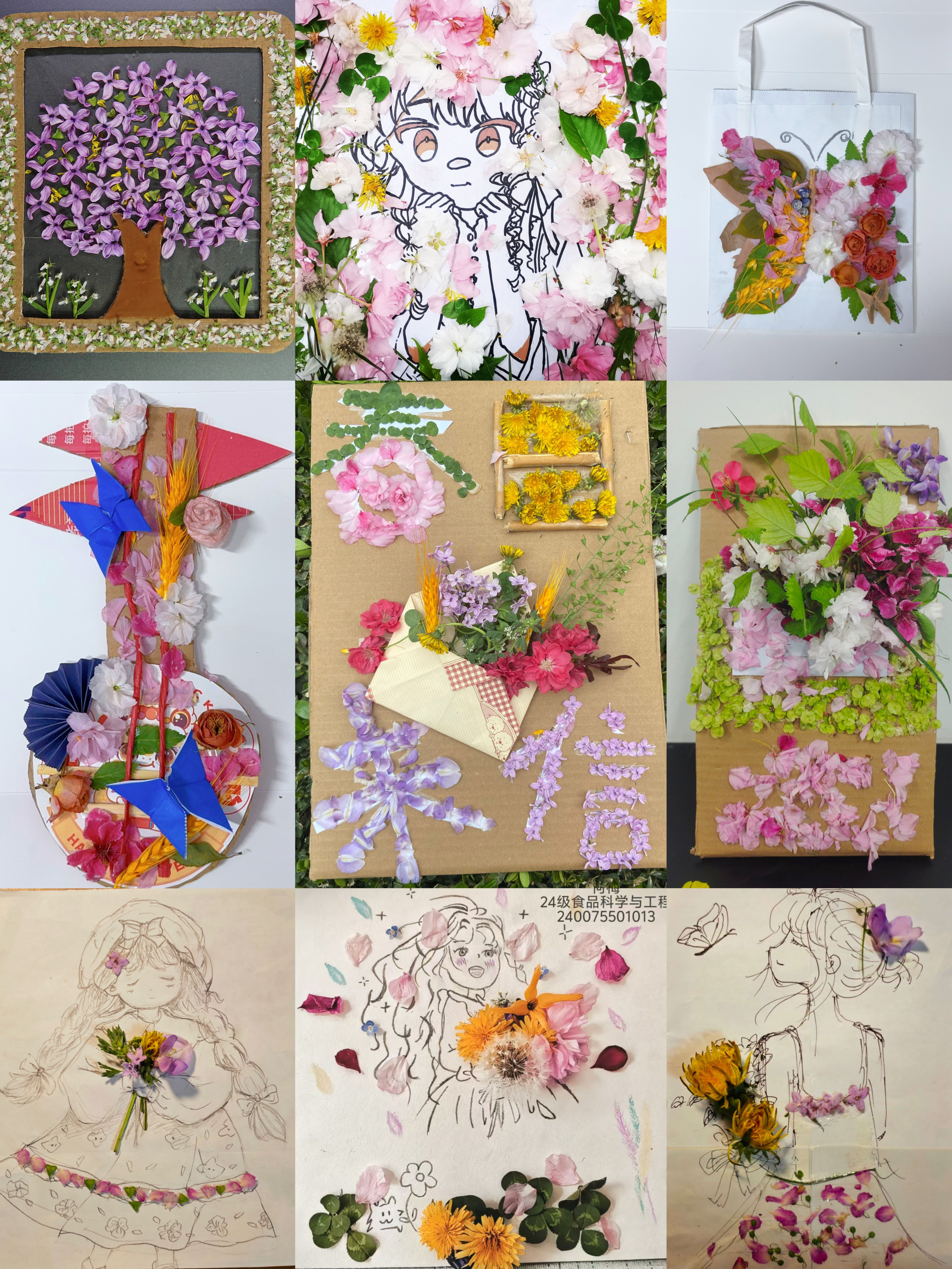 作为“以美润心”系列活动的学生自主实践单元,本次活动以“自然为材,创美于心”为宗旨,要求参与者收集校园落花进行创作,并通过线上平台提交作品,经评选,共选出优秀作品30件。活动中,同学们利用日常废弃的快递盒、纸箱、包装袋等材料,通过裁剪、拼贴,绘画等方式进行艺术创造。作品涵盖立体花篮、装饰画等,既赋予废旧材料新生,又传递了美育火种。